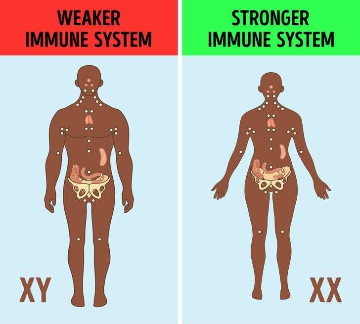 Maya Saleh dari Pusat Penyelidikan Universiti McGill mengenai Complete Traits mendapati hormon estrogen yang lebih banyak terdapat pada wanita berbanding lelaki berfungsi untuk menindas proses keradangan. Itu bererti badan wanita berurusan dengan penyakit lebih cepat dan lebih mudah.